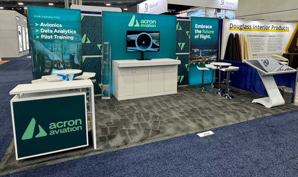 Acron Aviation promoted its avionics, data analytics and pilot training solutions in a 10' x 20’ inline corner booth. Three rental lightboxes with custom graphics and printed filler panels were joined together to create a custom backwall. A DSR video monitor and touchscreen kiosk provided digital engagement opportunities, while a lighted reception desk and café tables offered spaces for visitors to interact with booth personnel.