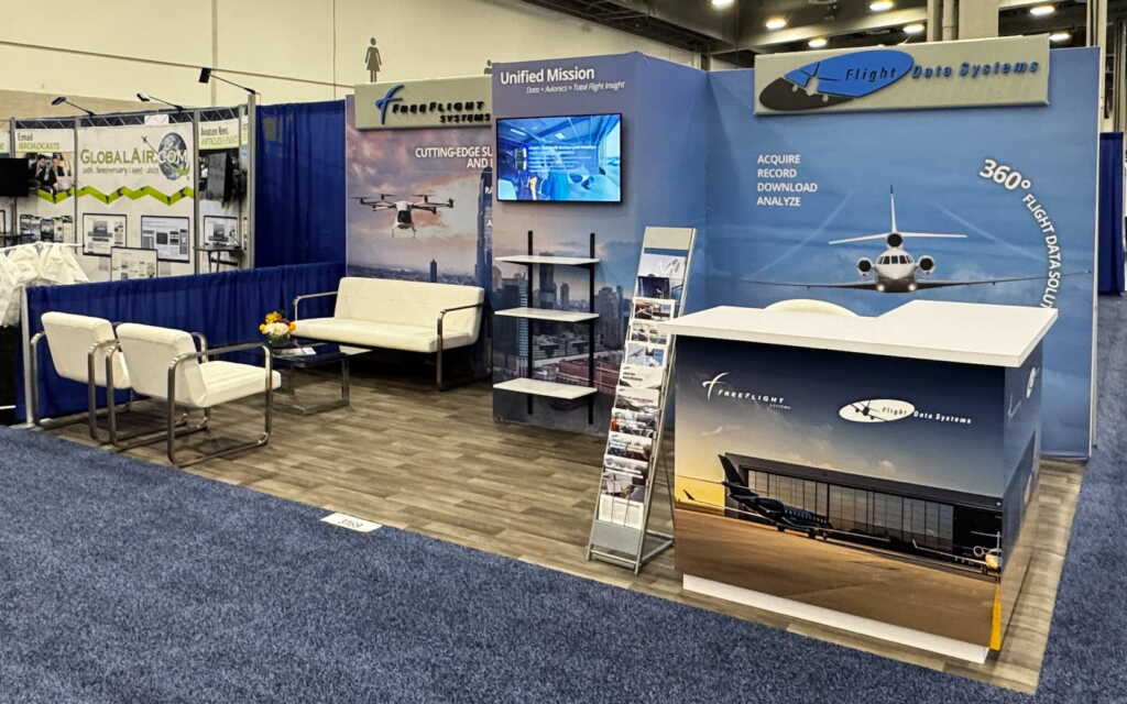 Flight Data Systems and FreeFlight Systems partnered in a streamlined 10’ x 20’ inline booth featuring a fabric backwall with die-cut dimensional logos and a video monitor to showcase its unified data and avionics products and services. An L-shaped reception counter and lounge seating provided spaces to meet, while integrated shelving and a literature rack enabled product demos and shared technical information.