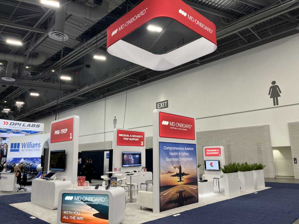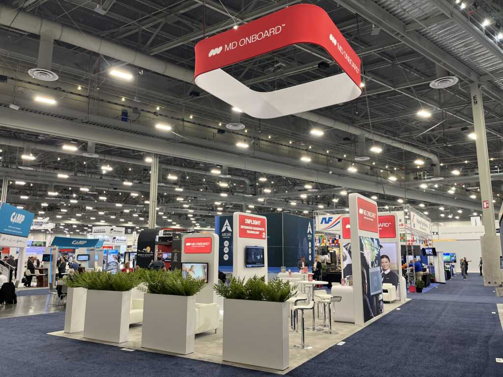 MD Onboard’s 20’ x 40’ custom island exhibit combined the brand’s design concept with practical engineering to achieve its layout goals. The booth featured four illuminated graphic towers with video monitors to showcase the company’s innovative new in-flight telehealth technology, connecting aviation staff with paramedics for real-time emergency care. Ample seating areas provided plenty of space for discovery meetings, while lush planter boxes offered a semi-private, comfortable feel.