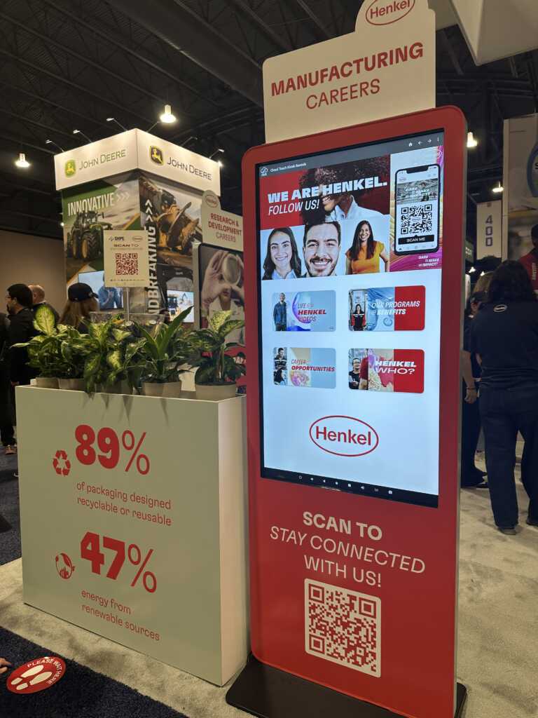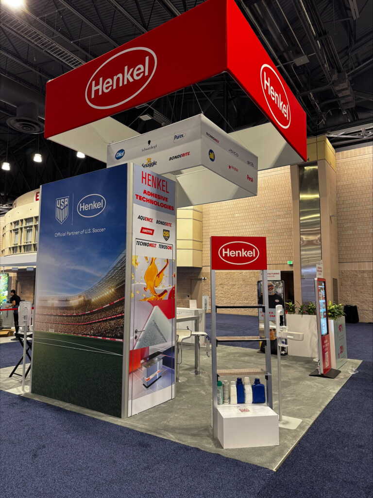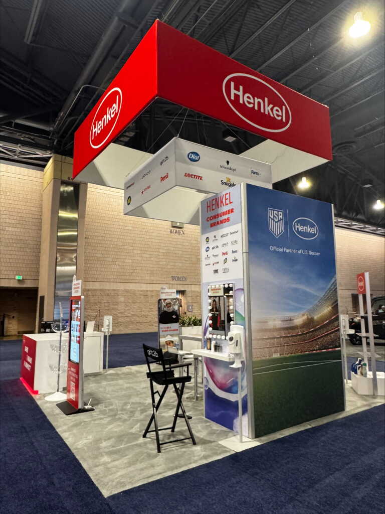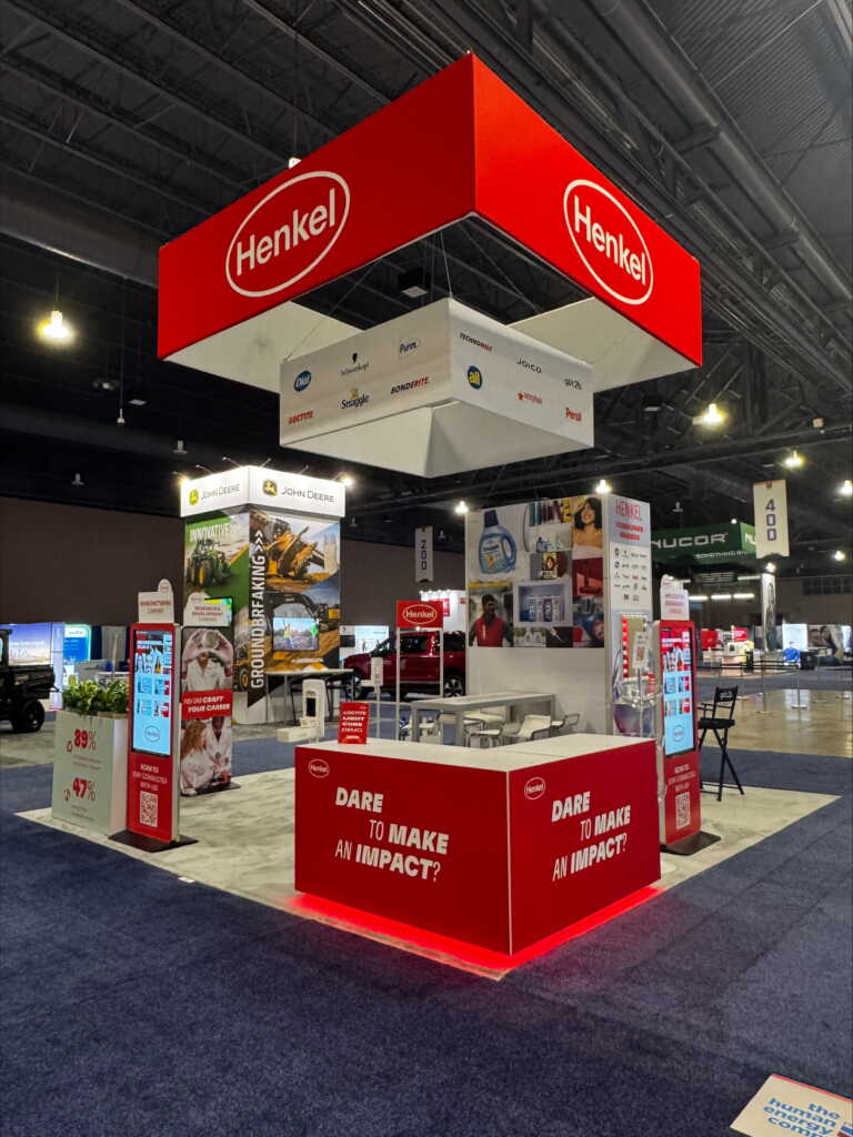 Henkel’s dynamic 20’ x 20’ island exhibit elevated engagement with three CloudTouch interactive screens showcasing career opportunities. The underlit L-shaped demo and reception counter served as both a focal point and a functional area for interaction. A graphic-wrapped closet highlighted the company’s consumer and adhesive brands, complemented by a dedicated U.S. Soccer sponsorship graphic and a glamorous vanity for its got2be beauty brand. Live planter boxes included sustainability messaging, while an eye-catching two-tier hanging sign amplified Henkel’s portfolio of consumer and industrial technologies.