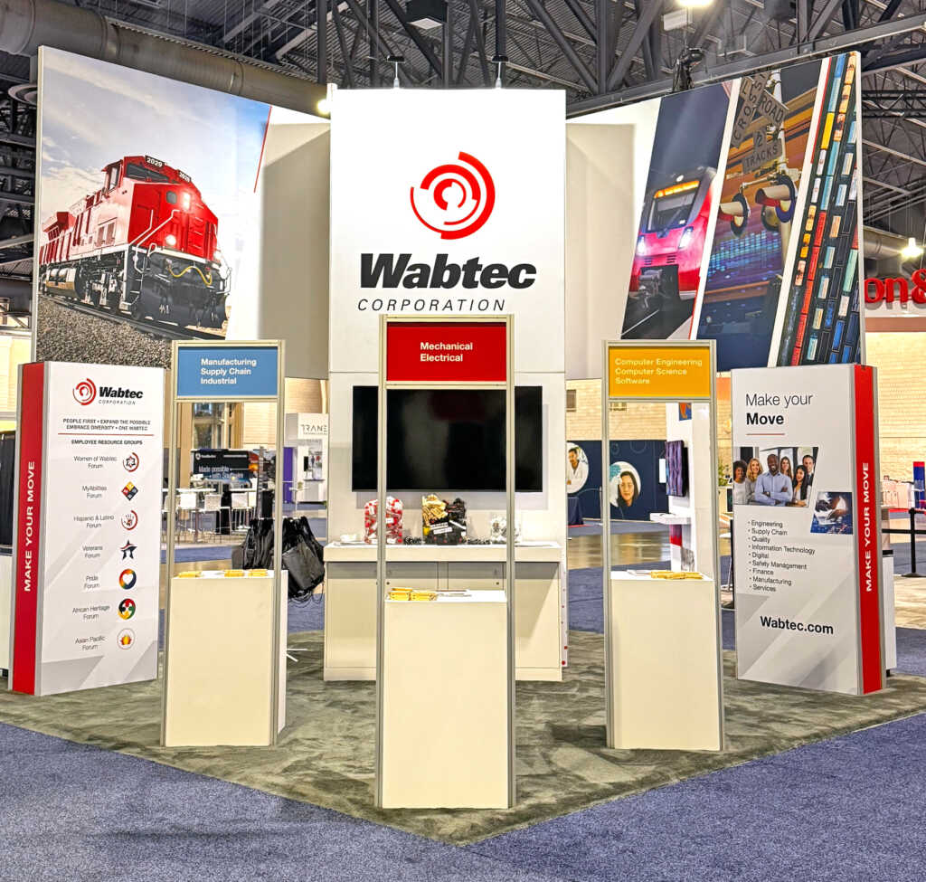 Wabtec presented a commanding 20’ x 20’ modular island booth featuring a soaring, graphic-wrapped central closet flanked by two prominent modular graphic panels, all unified under a dramatic header graphic. The front of the booth welcomed visitors with three career path kiosks, while a meeting area, surrounded by planter boxes behind the closet, provided a semi-private space for focused engagement. A 70” monitor out front and dual 43” monitors on the back panels enabled video presentations.