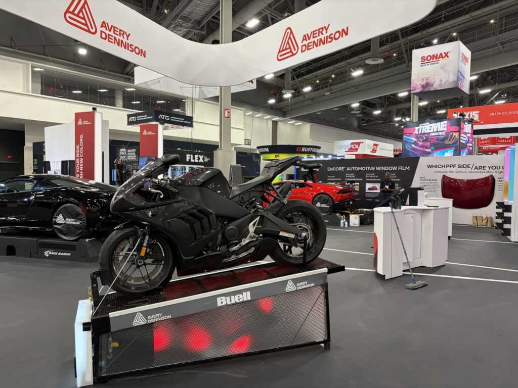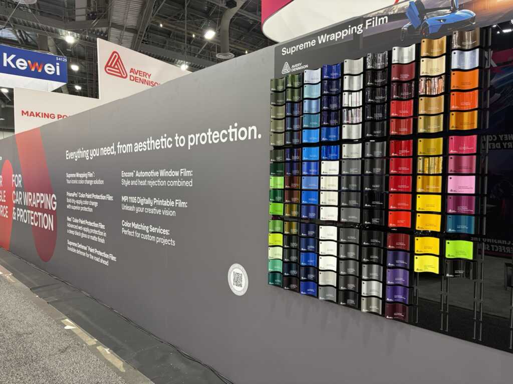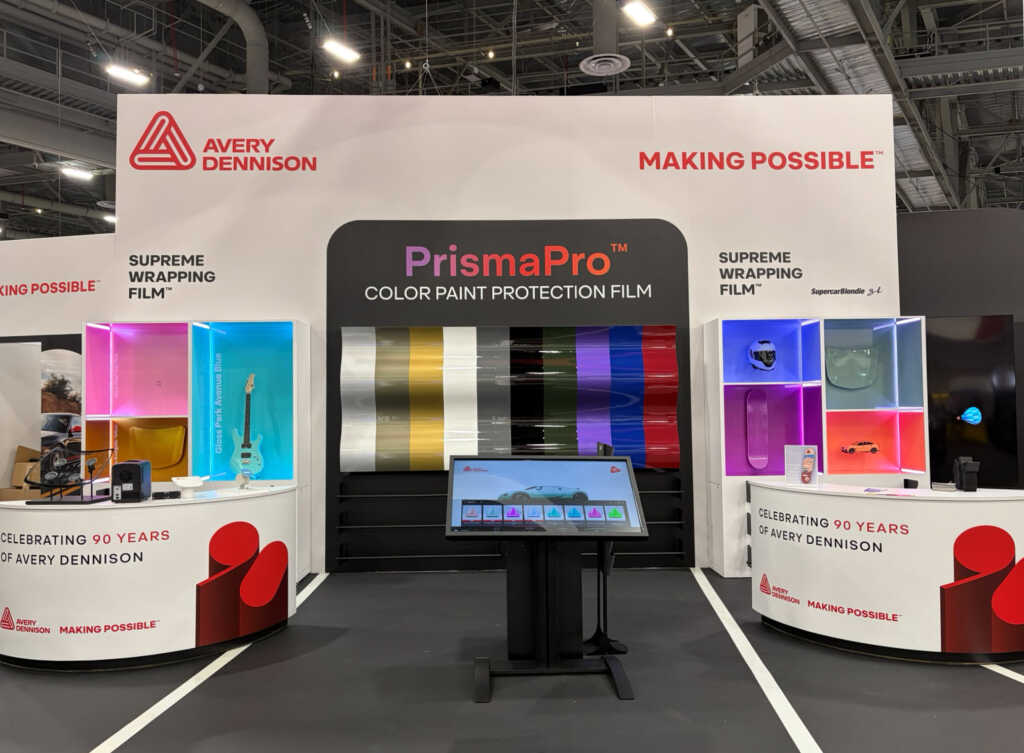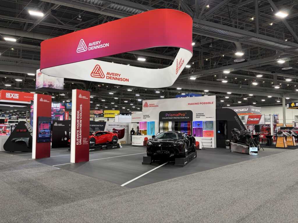 The Avery Dennison Graphics Solutions 50' x 50' island booth was anchored by an angled backwall featuring an eye-catching PrismaPro color PPF display in the center with two Supreme Wrapping Film application displays on each side. An interactive touchscreen kiosk was flanked by two curved counters that served as application and visualizer demo areas. The always-popular Wrap Battle experience, along with two car wrap demos and a motorcycle wrap demo, provided hands-on engagement. A 40' side wall delivered product education on both sides while joining the angled backwall to create a cleverly concealed storage area. Edge-lit towers with video monitors and key messaging on the aisle, unique floor striping, the logo-shaped hanging sign and spotlights from the ceiling captured attention from the aisles and across the show floor.