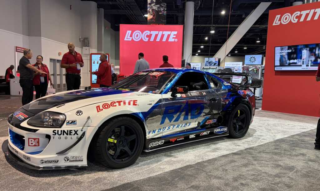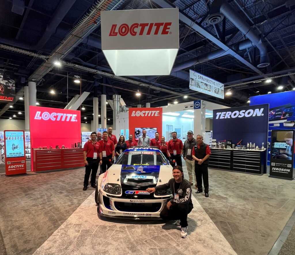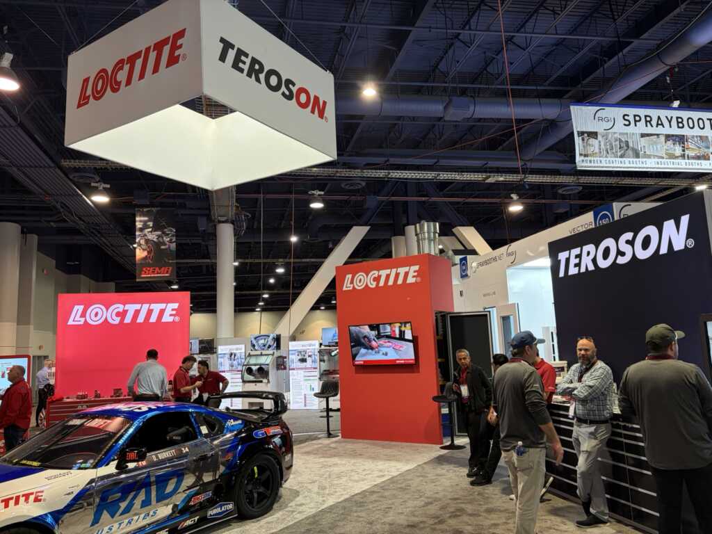 LOCTITE/Henkel's 30' x 30' island exhibit featured two backlit rental graphic walls and a sleek corner closet to promote its LOCTITE and TEROSON vehicle repair, adhesive, coating and sealant solutions. A 60" video monitor provided key messaging while two vertical touchscreens showcased the company's interactive app experience. The RAD Industries Formula Drift car connected the brand's product performance to the motorsports industry while the overhead sign ensured visibility from every angle.