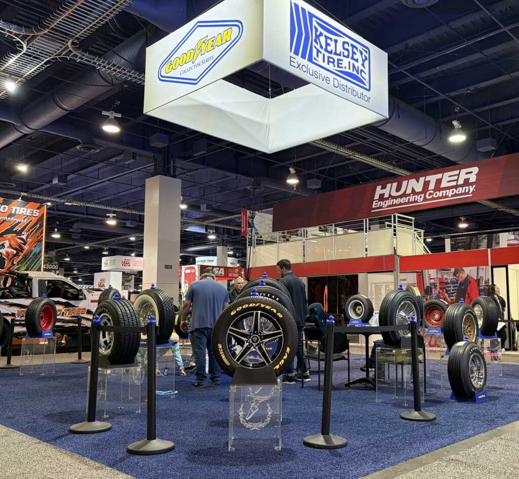 For collectors and classic enthusiasts, the Kelsey Tire 30' x 30' island featured multiple plexi display stands to showcase its vintage Goodyear tires. A hanging sign and branded central reception desk welcomed attendees to this era-spanning, interactive space.