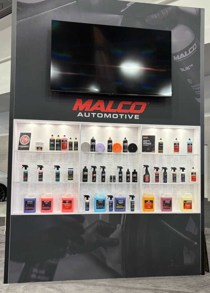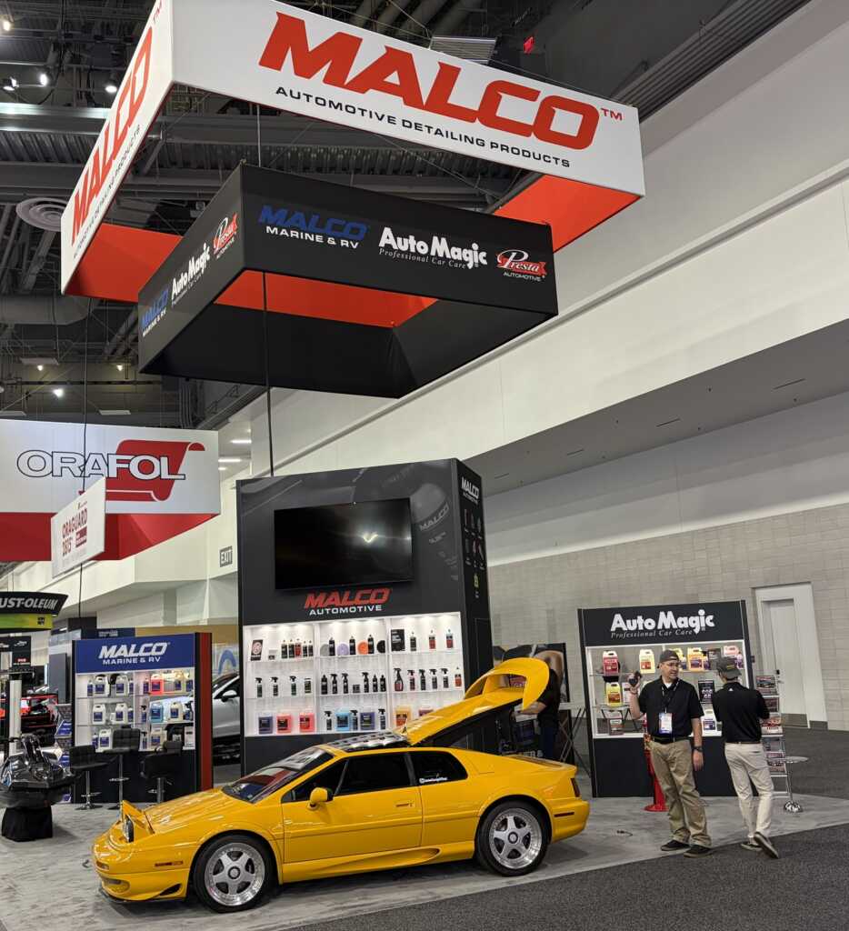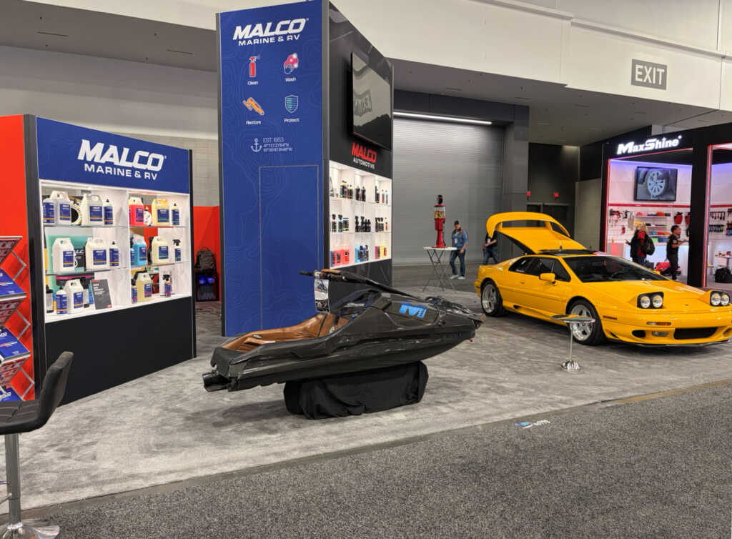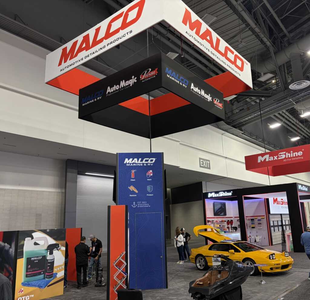 Malco Automotive's 30' x 30' island booth featured an attention-grabbing 14-foot-tall center tower with illuminated display shelving and 85" monitors on both sides, along with a storage area on the inside. Adjacent kiosks echoed the dual-sided, lighted shelving, providing additional space for product displays. A hexagon-shaped conference room used graphic-wrapped, 6.5-foot-tall wall panels to create a semi-private meeting and hospitality space. The two-tiered hanging sign promoted the company's various brands, while a jet ski and vintage Lotus combined to showcase its line-up of automotive, marine and RV detailing products.