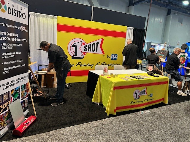The Matthews Paint/1 Shot by PPG 10' x 20' inline booth put four interactive artist stations alongside a vibrant, branded backwall and table throw. This efficient space offered visitors opportunities to engage with painters demonstrating the brand's pinstriping and sign-painting products.