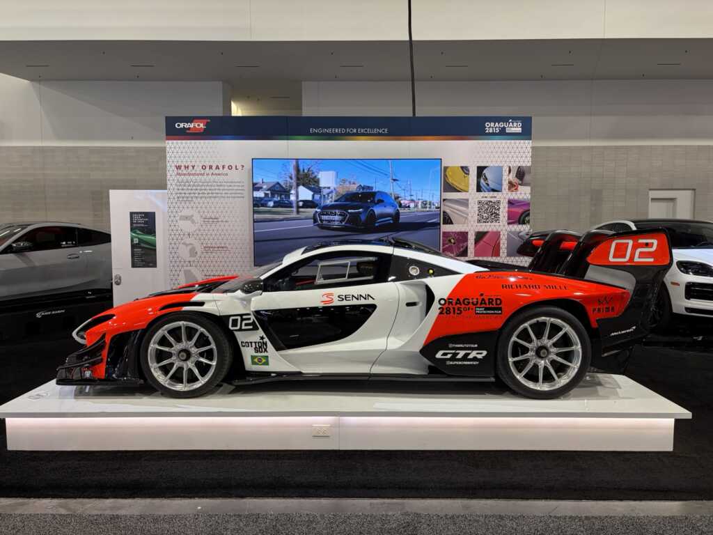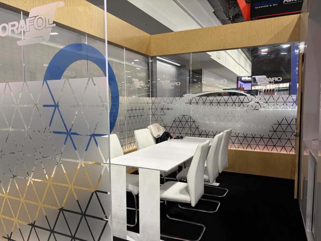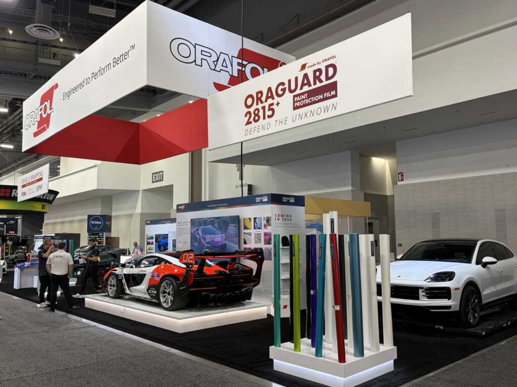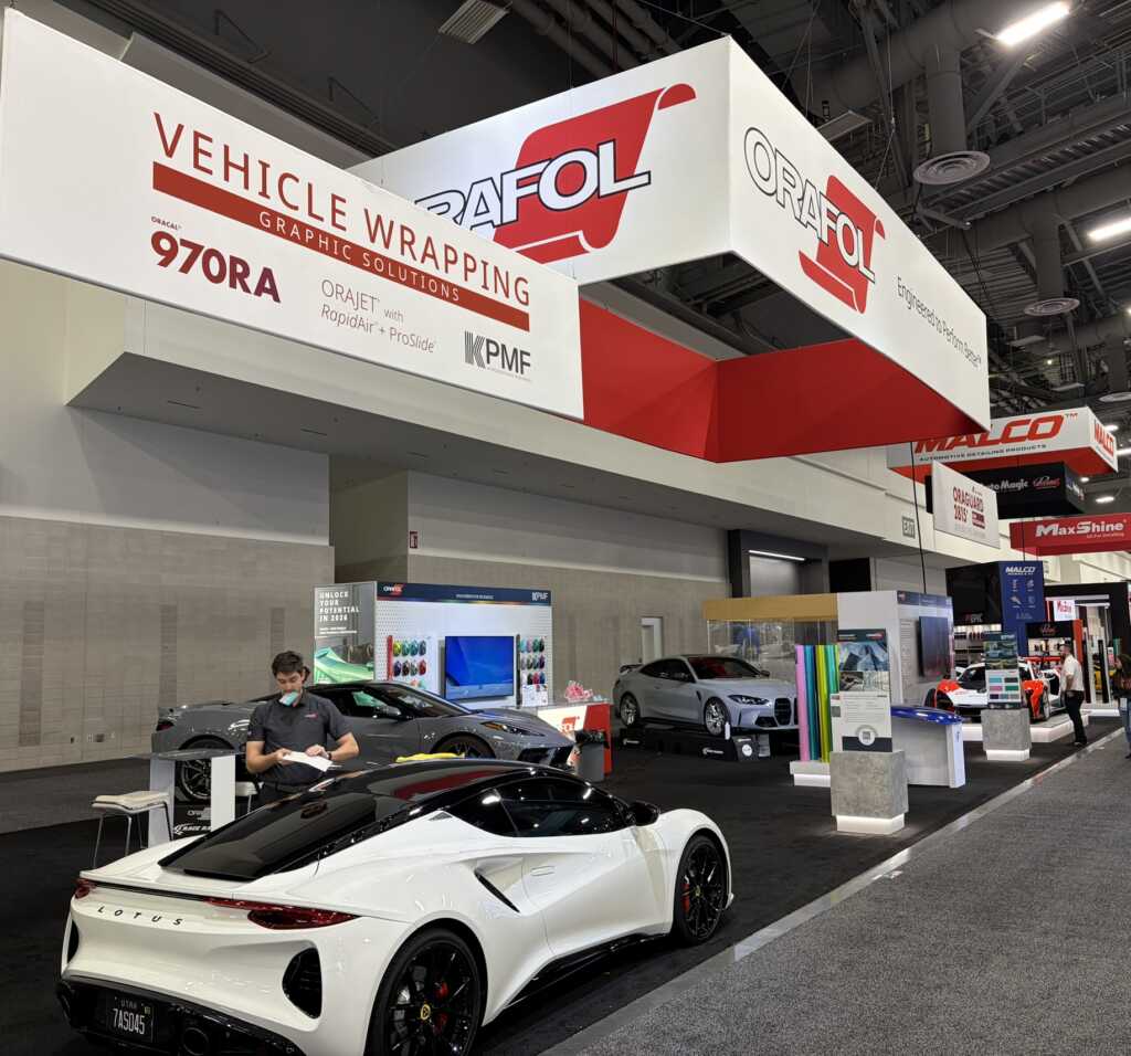 ORAFOL & KPMF promoted their new ORAGUARD PPF line, engineered vehicle wraps and graphic marking films in a 30' x 90' island exhibit. One graphic storage closet featured a 100" video monitor on the front, with a plexiglass-enclosed conference room on the back. Another closet structure included product displays and a 75" monitor on the front, with lightbox graphics on the sides. Three lighted and branded reception counters and underlit graphic pedestals were on the aisles, while a 12' tower with film display stood in one corner. Two product roll displays and a hood wrap demo allowed visitors to interact with the products. Three vehicle wrapping demos were accompanied by a pre-wrapped Lotus and a pre-wrapped McLaren on an illuminated platform, drawing visitor interest and engagement. A massive, rectangular hanging sign was flanked by two banner-style signs above, making the booth a show floor landmark.