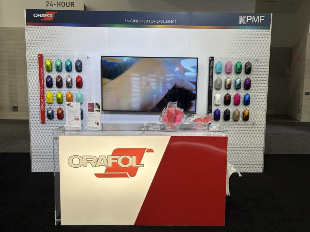 ORAFOL Americas, recognized globally for its innovation in adhesive films, reflective materials and high-performance graphic solutions, showcased its capabilities in a 20’ x 30’ island booth. Visitors engaged with live demos, including vehicle wrap installations and textured-surface film applications on a brick wall. A 16’ x 4’ closet featured lightbox graphics, integrated product display shelving, a 60” video monitor and key brand and product messaging. Other booth features included a vinyl tape roll display, two branded literature counters, café seating and a large hanging sign visible from afar.