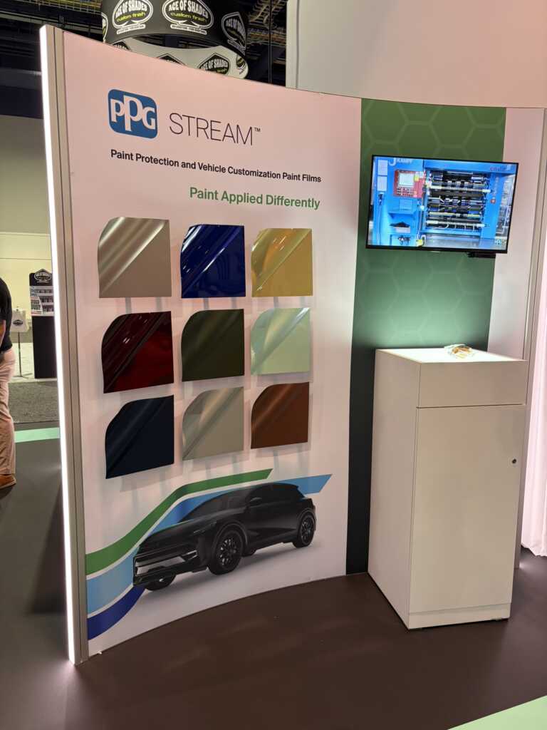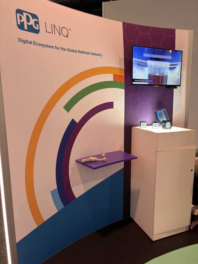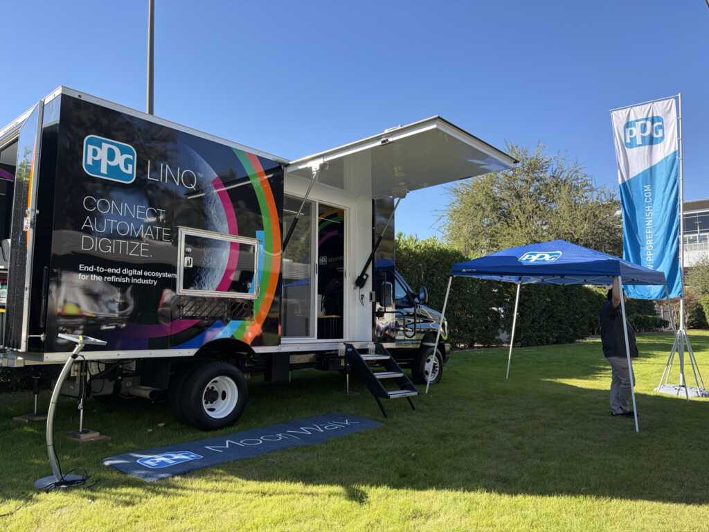 PPG Refinish engaged attendees in two booth spaces, including an indoor 20' x 20' island booth and an outdoor 20' x 40' space. Inside, the exhibit featured curved product display walls with sidelights, shelving and monitors to promote the brand's PPG STREAM films, SEM refinishing products and LINQ digital ecosystem. A fourth kiosk featured an interactive touchscreen kiosk to promote PPG's DigiMatch color-matching software. Outside, the company's MoonVan, a traveling roadshow demo, showcased the MoonWalk automated paint-mixing system, while an outdoor tent, two wind-dancer flags and an iPad stand helped capture attention and generate new leads.