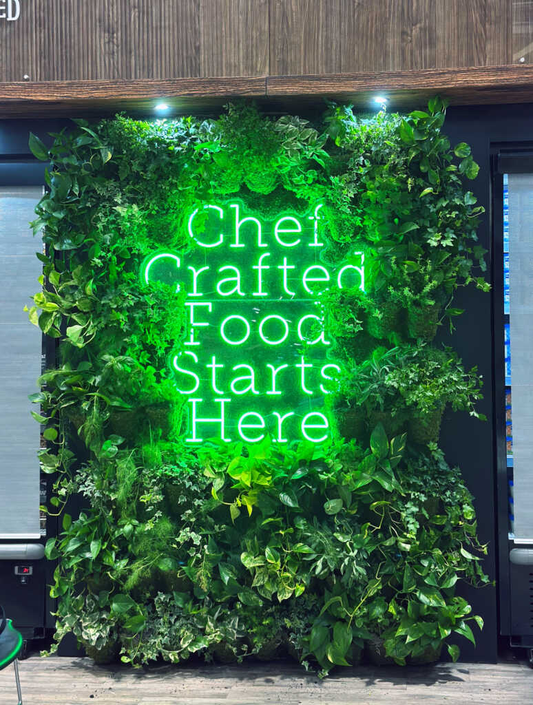 This 20' x 30' custom island booth featured rich, wood-look elements and a live floral wall for warmth and visual impact. An L-shaped hanging sign with a rectangular inset carried through the natural feel and ensured visibility from afar. Multiple coolers displayed a wide array of fresh products, while a prominent counter at the booth’s front drew in crowds for tastings.