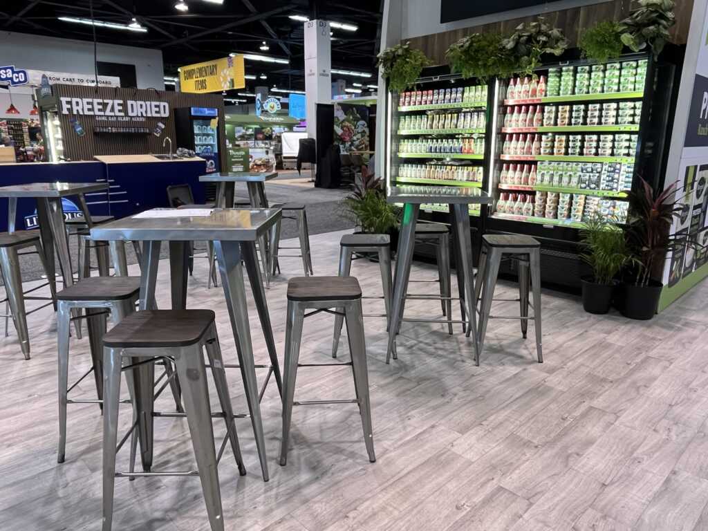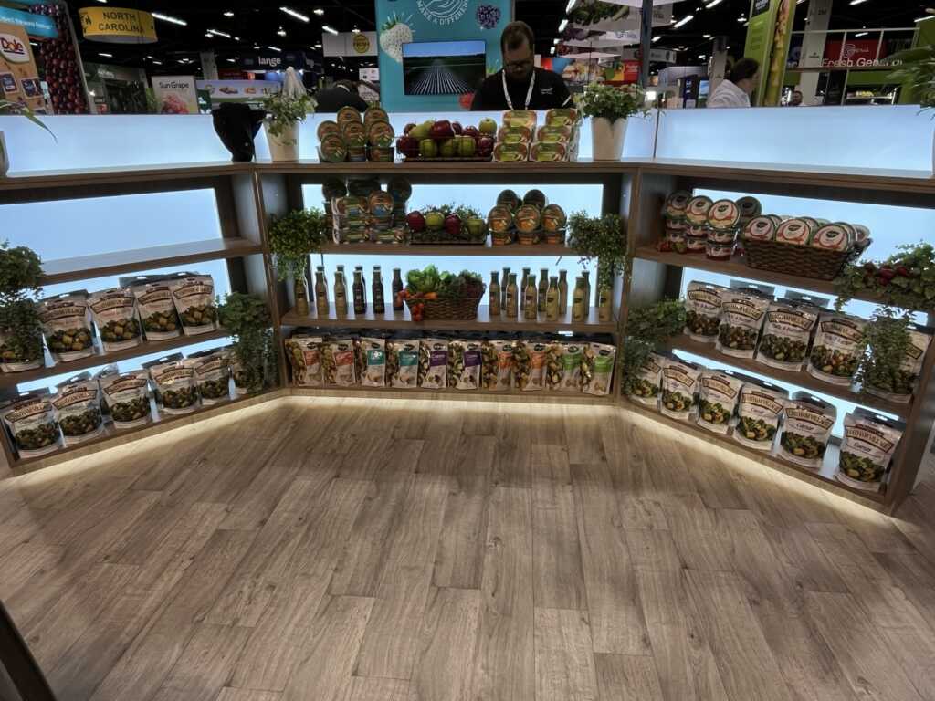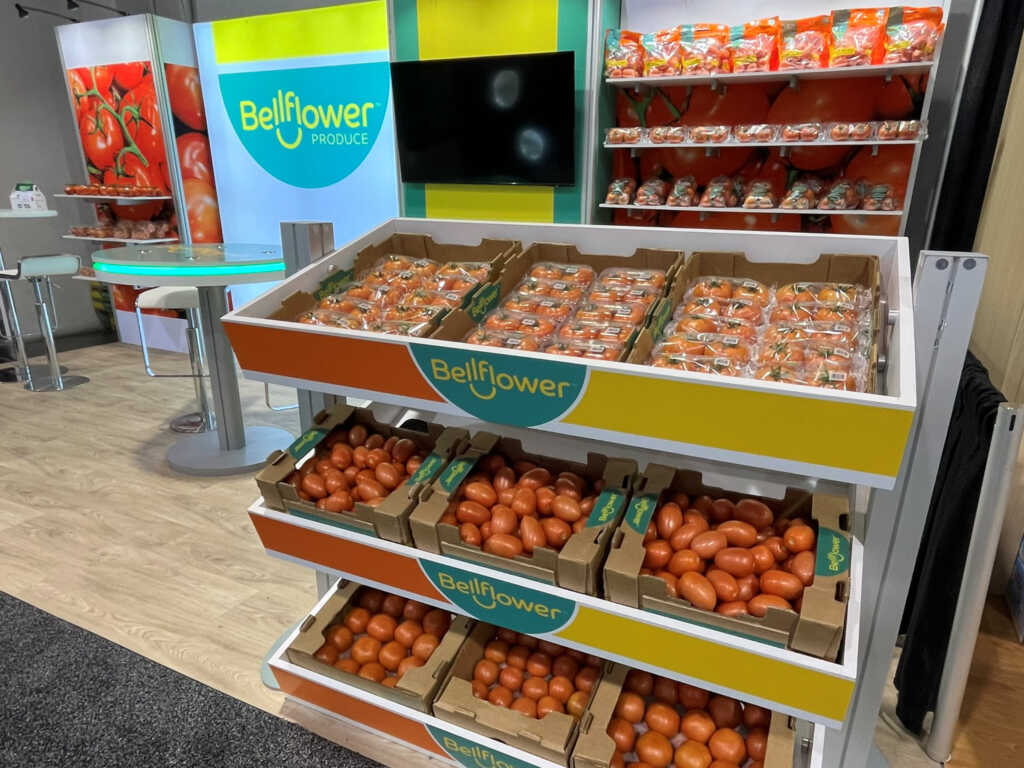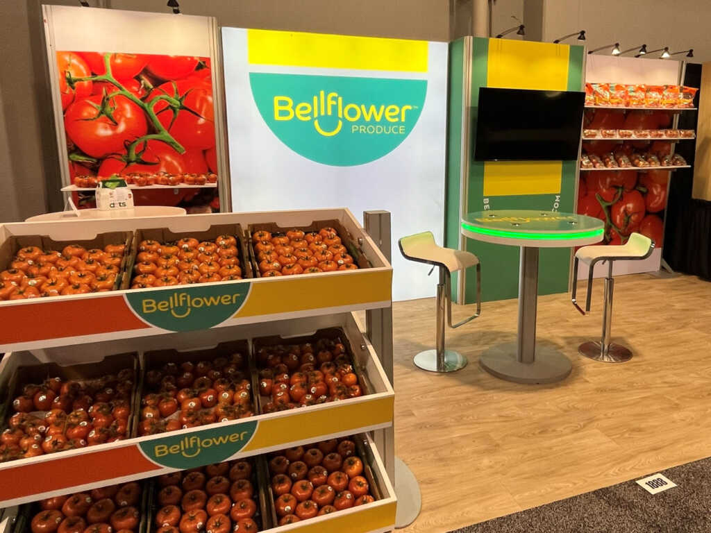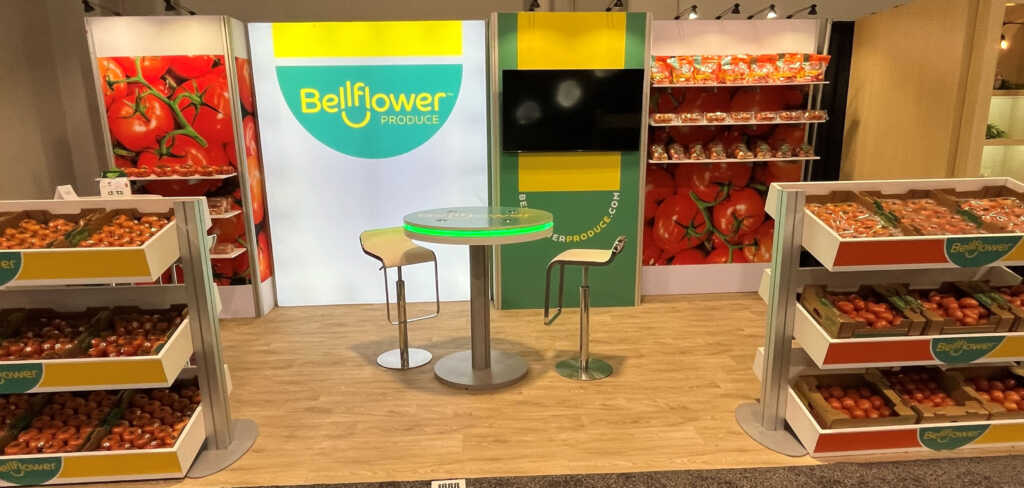 Bellflower Produce welcomed attendees into a bright 10’ x 20’ inline rental booth. The backlit wall, video monitor and glowing branded café table with built-in charging ports caught attention from the aisles. Shelving and displays featuring the brand’s high-quality, non-GMO tomatoes in various packaging formats created an appetizing visual experience.