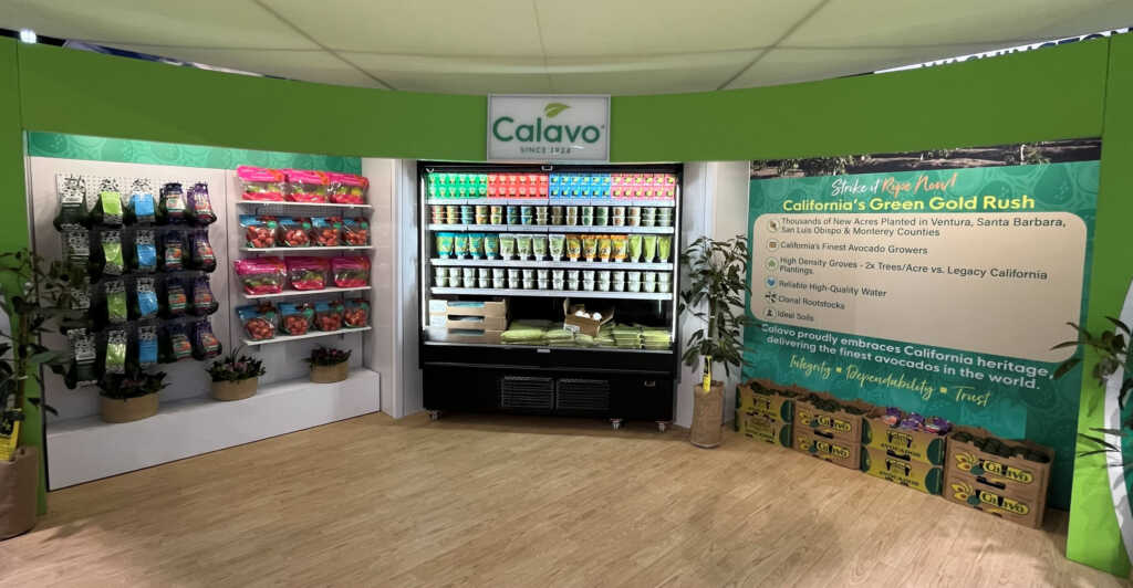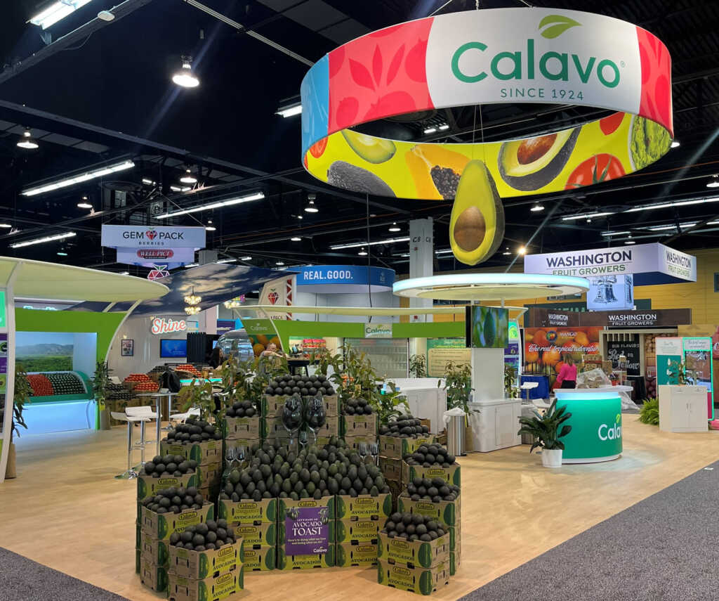 Calavo Growers showcased its delicious fresh produce with a rotating hanging sign and bold avocado centerpiece in this 50’ x 40’ custom island exhibit. The circular reception area with its lighted canopy and dual video monitors created a bright and welcoming focal point, while café seating offered multiple spaces to engage. Two curved structures on the corners featured built-in storage, high-resolution graphics, fabric canopies and ample space for product displays.
