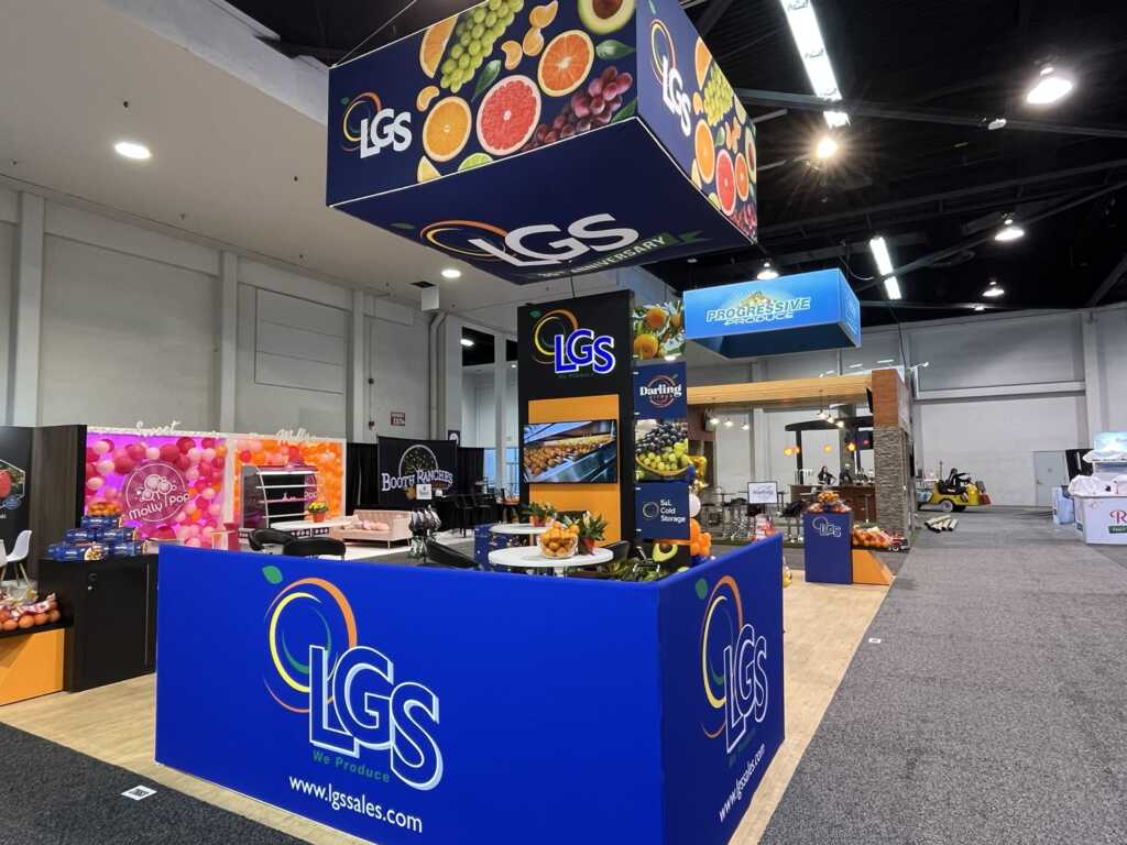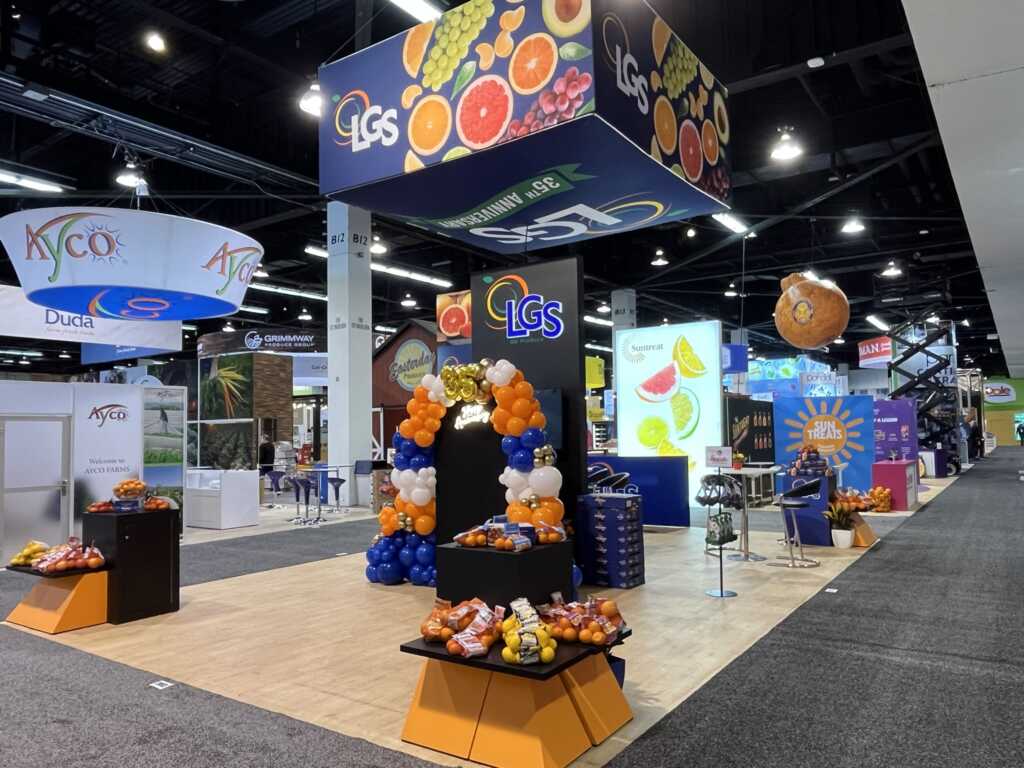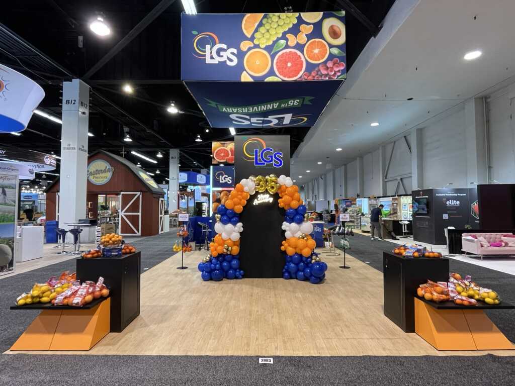 LGS Specialty Sales celebrated its 35th anniversary in a bright and cheerful 20’ x 30’ island booth. An eye-catching hanging sign was centered over a graphic tower with video monitors and a fun balloon installation. Colorful product displays on three corners provided space to promote its mouthwatering Darling Citrus line, while a branded pony wall and comfortable seating area created a designated space for tasting and conversation.