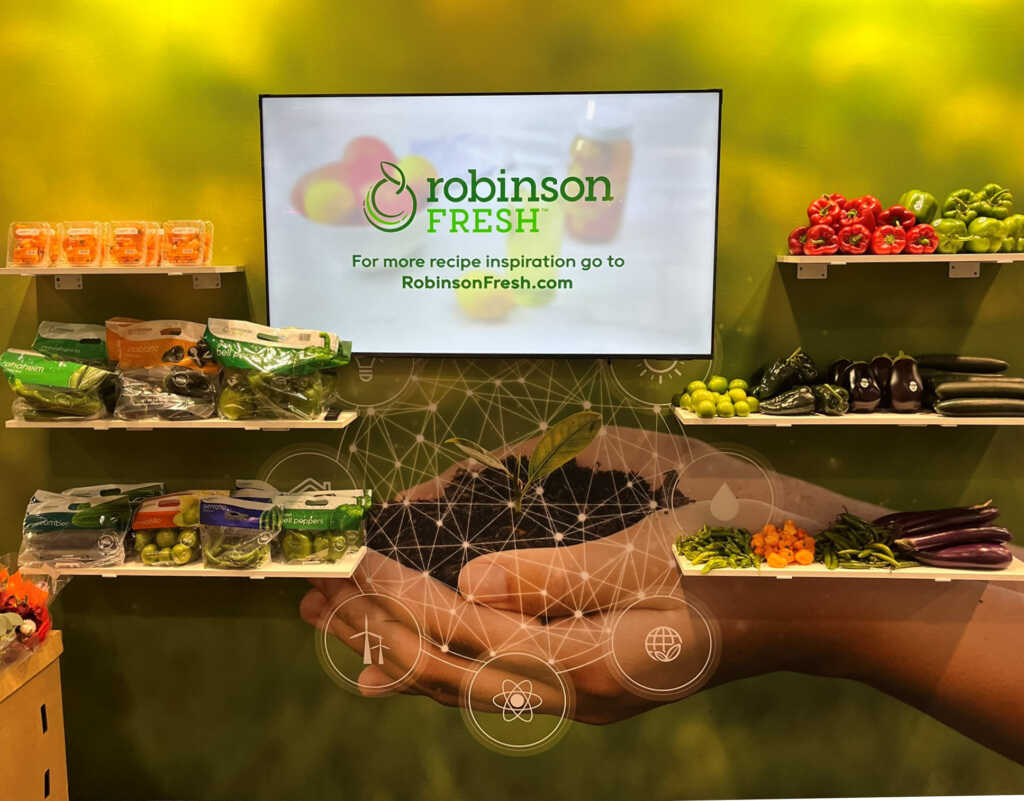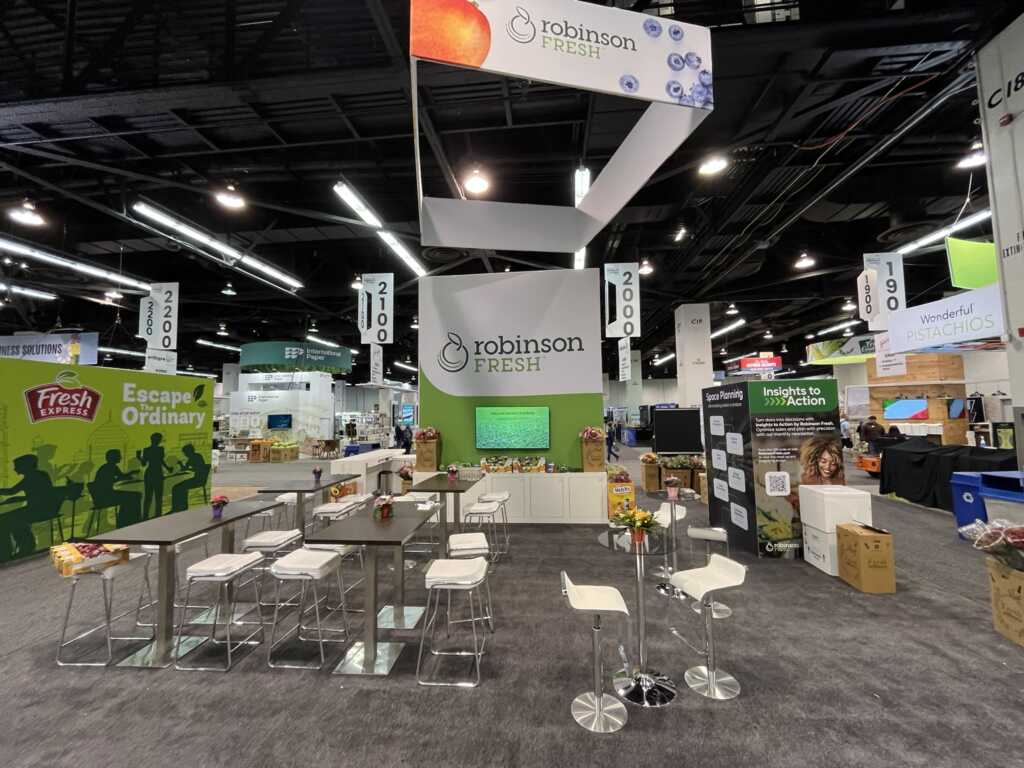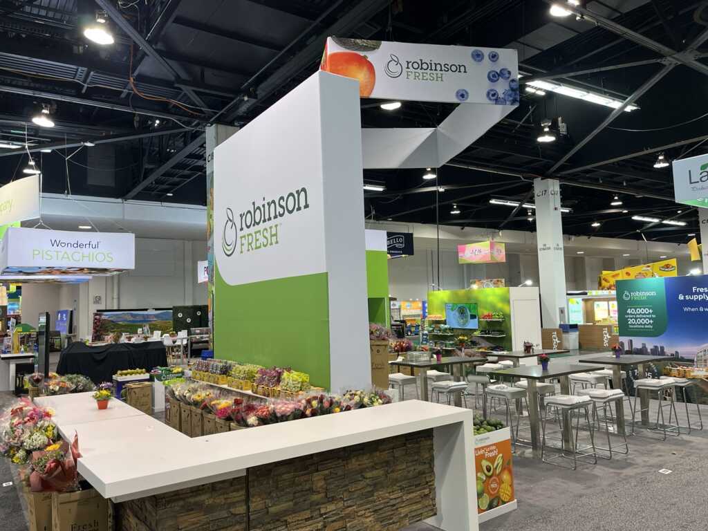 Robinson Fresh emphasized its sourcing and distribution solutions in a 30’ x 40’ island exhibit with an eye-catching, rectangular rotating sign and 12’ x 16’ center tower. A large demo counter, surrounded by fresh flowers and produce, created a striking focal point, while a well-defined seating area allowed visitors to interact and sample products. Two storage closets provided graphics and messaging space, with one also featuring display shelves and a video monitor.