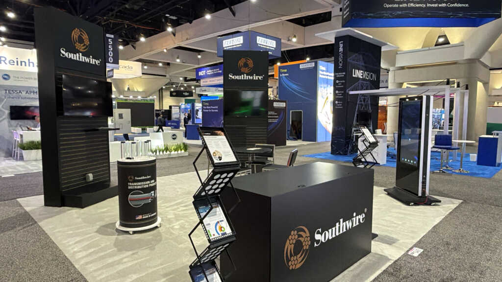 Southwire showcased its T&D wire and cable solutions in a 20’ x 20’ island booth. Corner towers featured lightboxes on the aisles and A/V monitors on the interior. A double-sided touchscreen and barrel-style wire display kiosk, along with a central reception area, created multiple visitor touchpoints.