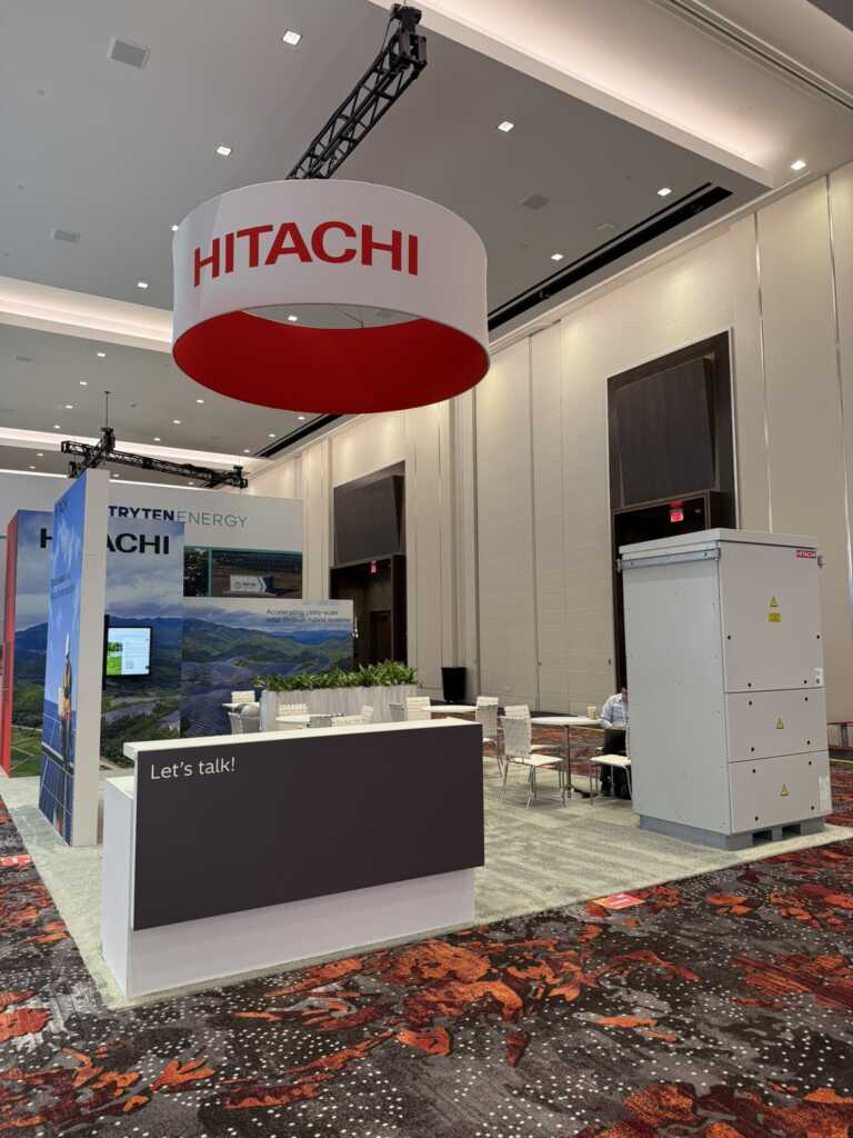 Hitachi Energy showcased its solutions for a more resilient energy future in a 20’ x 30’ island exhibit featuring a 12’ circular hanging sign, video monitors, a storage closet, a reception desk, and ample meeting areas. A switchgear product demo in front of the booth, along with large graphic walls and planter boxes on the sides and back, helped define the space and convey key messaging.