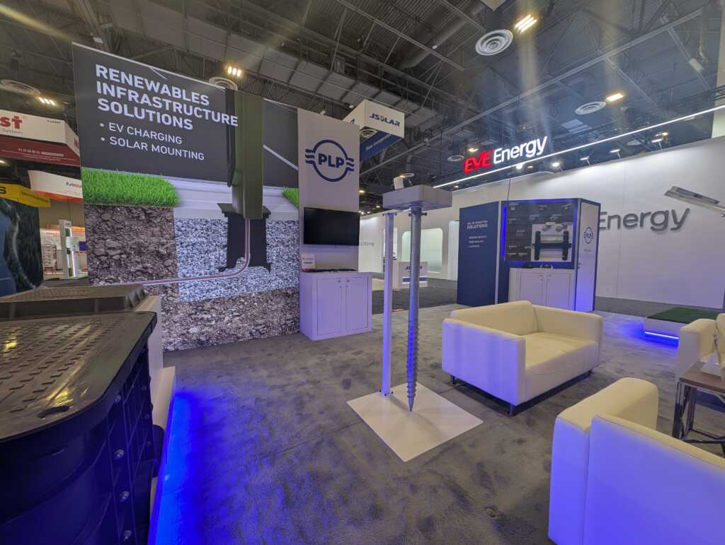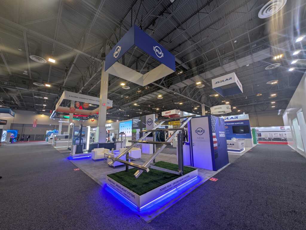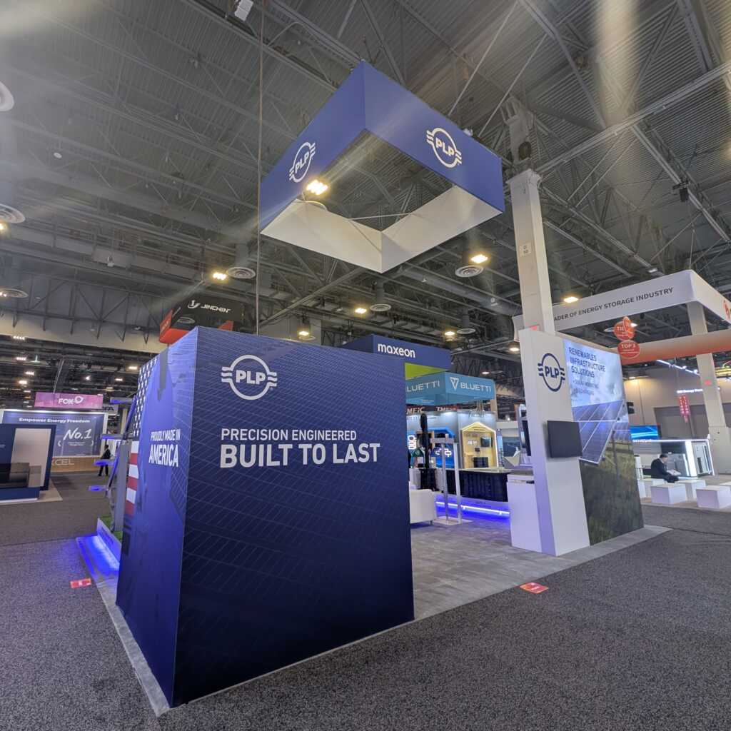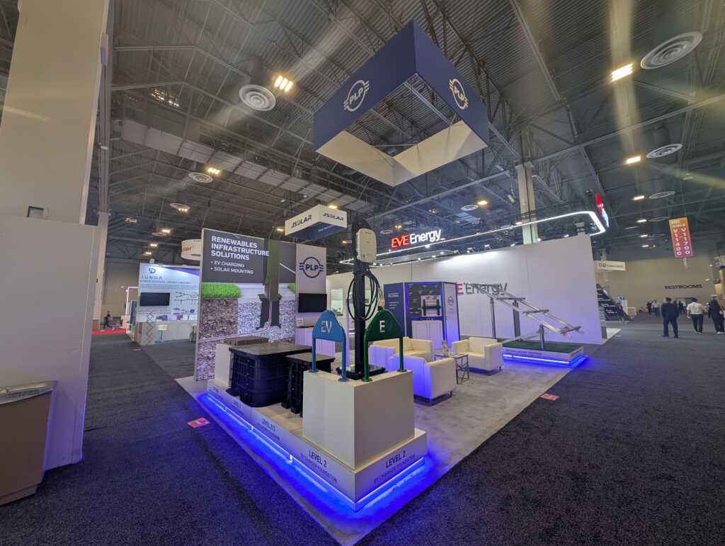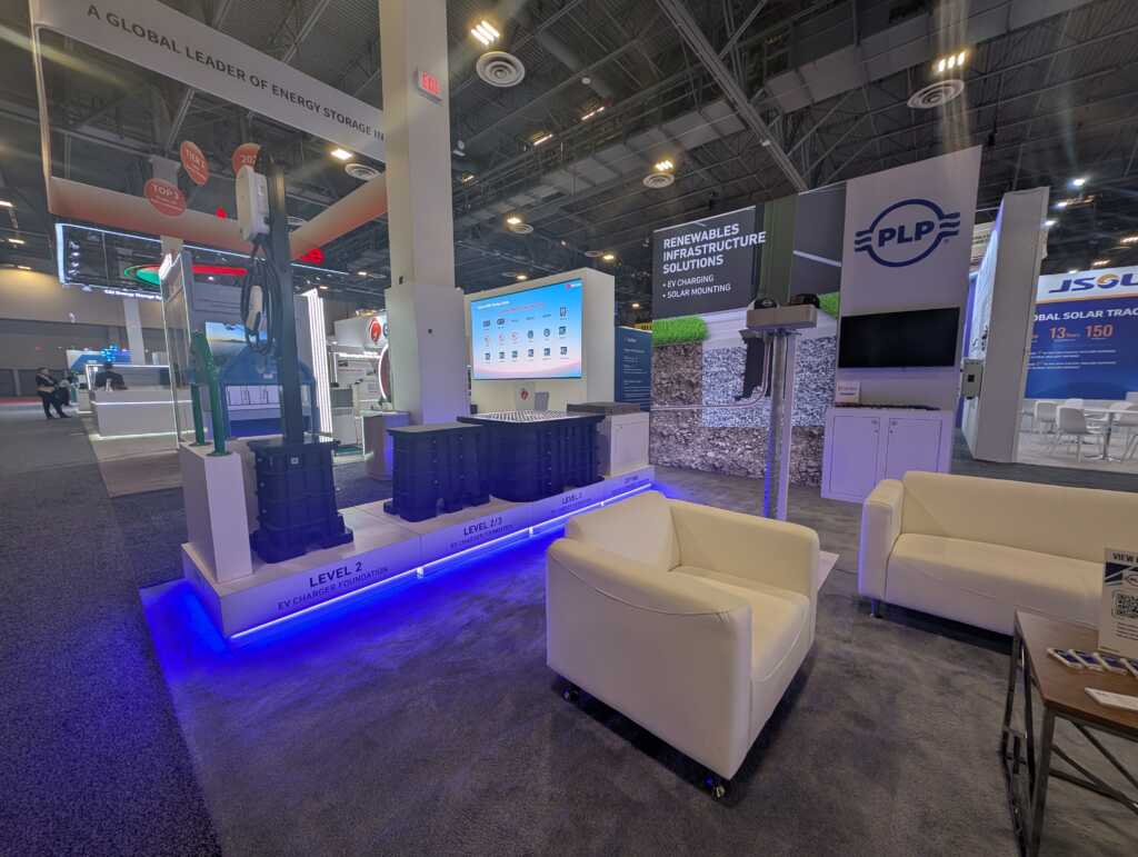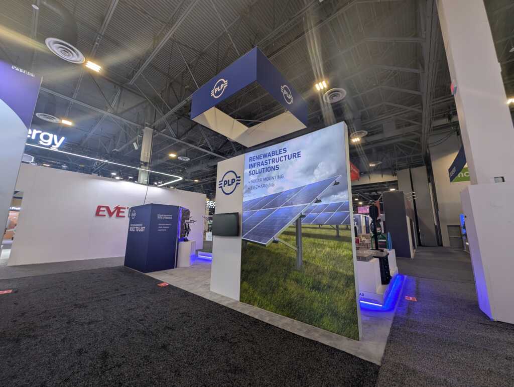 PLP highlighted its EV charging and solar racking systems in a striking 20’ x 30’ custom island booth. A large, backlit, double-sided backwall featured video monitors on each side, while a corner closet unit provided space for product displays, key messaging and secure storage. The hanging sign was visible from across the show hall and illuminated product risers captured attention from the aisles. Lounge seating provided visitors a comfortable space to engage with booth personnel.