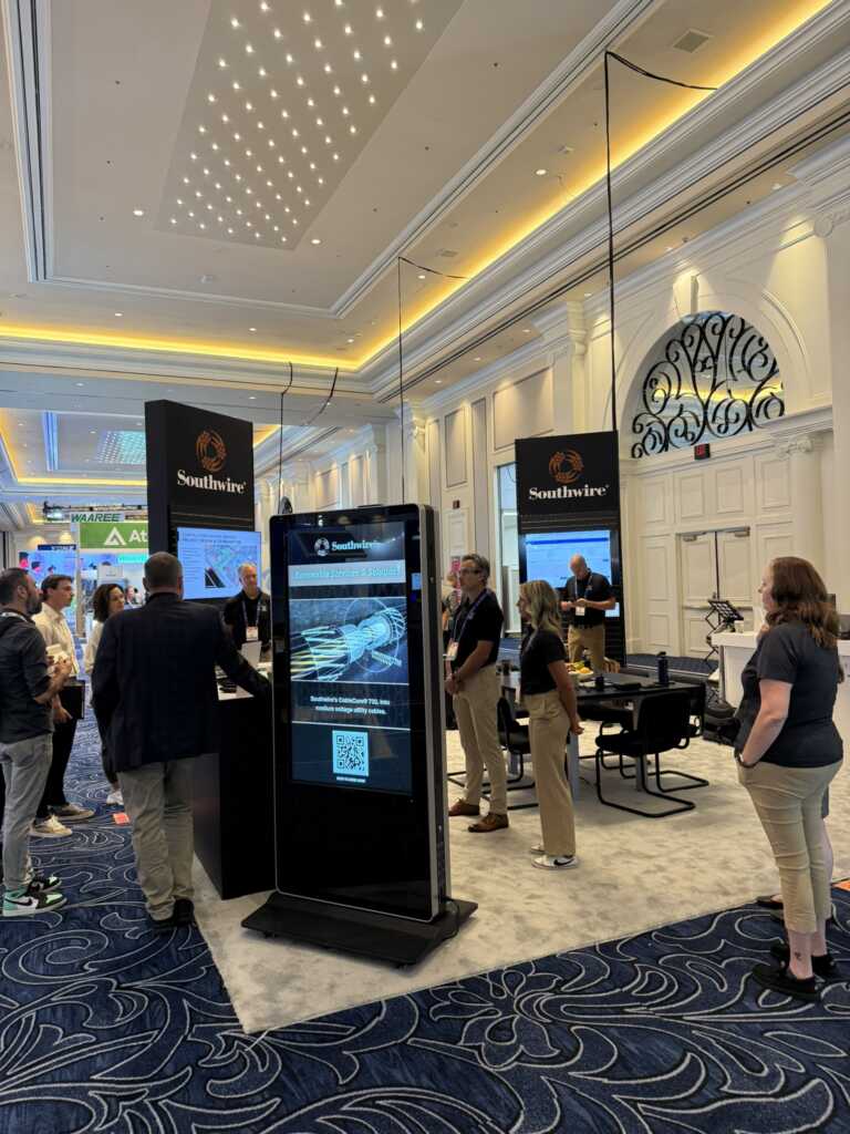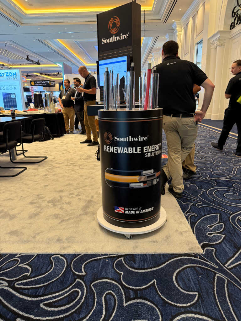 Southwire leveraged digital and physical displays, along with hospitality, to showcase its renewable products and services in a 20’ x 20’ exhibit. A digital video display and two double-sided towers combined lighted graphics and monitors for visitor interaction. A barrel demo showcased the brand’s cable solutions, while seating in the center of the booth provided a space for small gatherings and meetings.