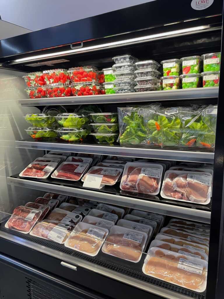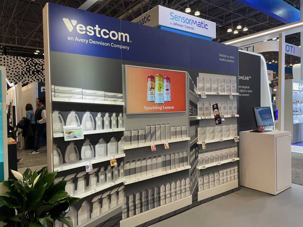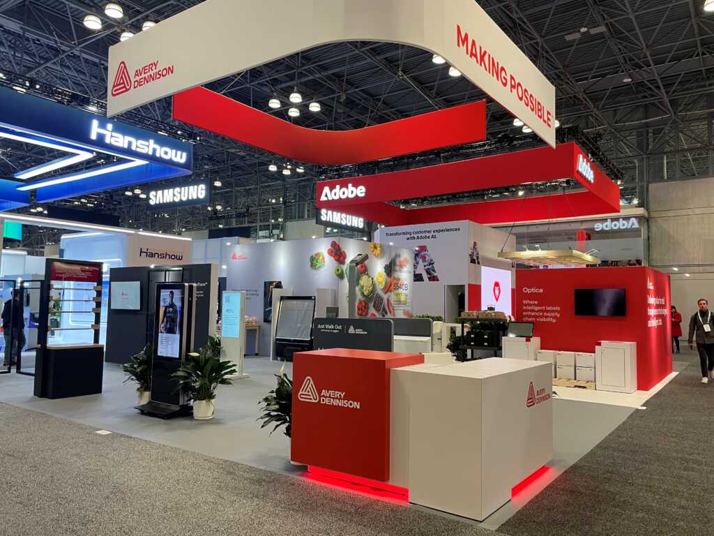 Avery Dennison's 40' x 40' island exhibit spotlighted its item-level intelligence from source to store, with displays dedicated to food, apparel, Amazon's Just Walk Out technology, Vestcom's shelf-edge media, and back-of-house labeling solutions. Booth features included a graphic-wrapped storage closet and a fully enclosed conference room with a ceiling. Two touchscreen kiosks and multiple video monitors provided interactive content, while a coffee bar and hospitality area surrounded by planters created a comfortable setting for one-on-one engagement. The two-piece hanging sign and underlit reception desk ensured the booth and brand were highly visible.