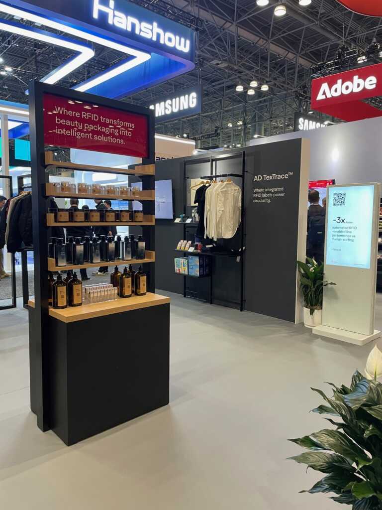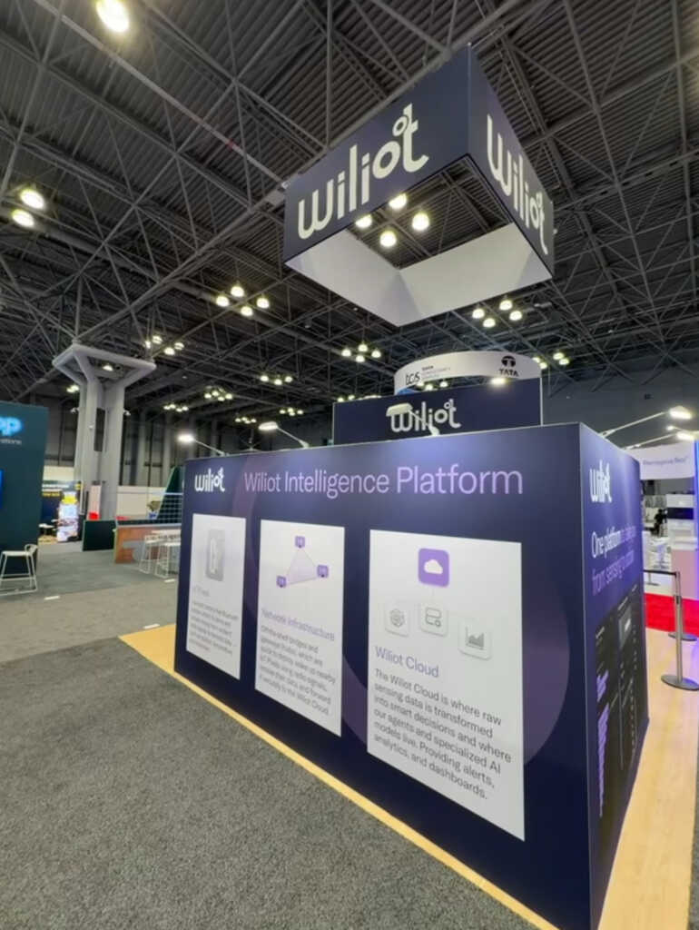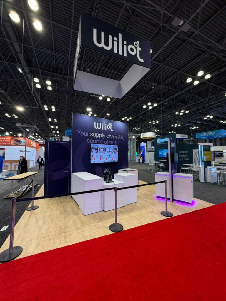 Wiliot used its 20' x 20' island booth to launch its scan-free Gen 3 IoT Pixel sensors, highlighting how ambient IoT can deliver continuous visibility across complex retail supply chains. An attention-grabbing, angled front wall with a large video monitor provided a great backdrop for a fun beanie giveaway with a live heat-press patch station. The attached conference room offered ample space for graphics and messaging, while the adjacent storage area remained discreet. Visitors could also engage with the two-sided demo kiosk, where dual monitors and lighted pedestals created a defined focal point. The overhead hanging sign and laminate-look flooring tied everything together into a polished, welcoming space for attendees.