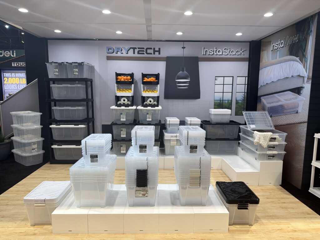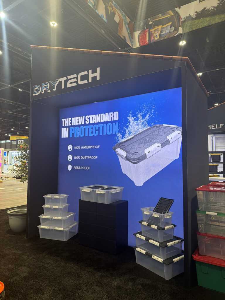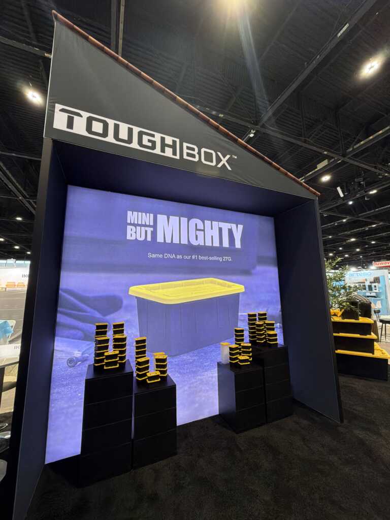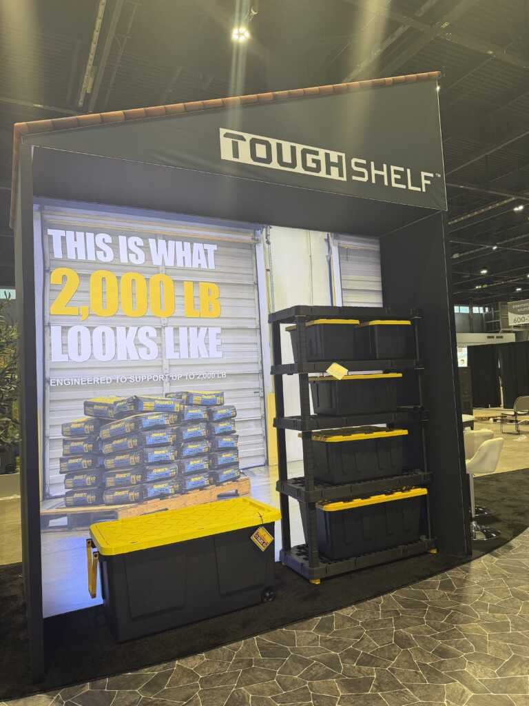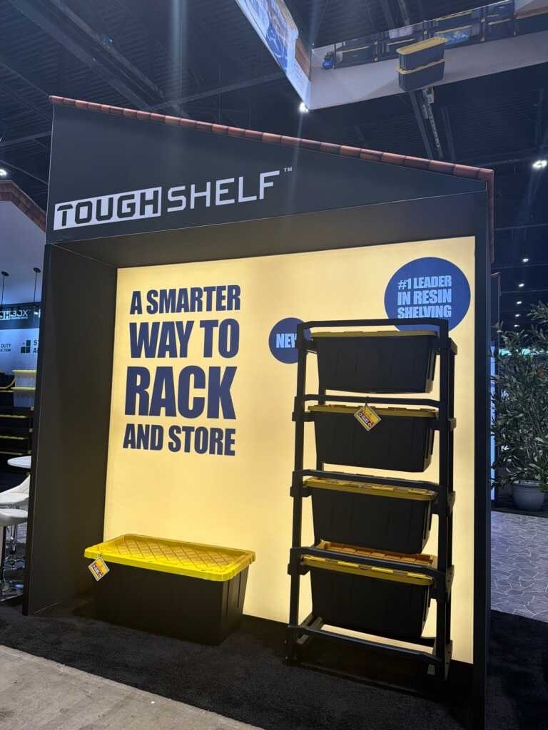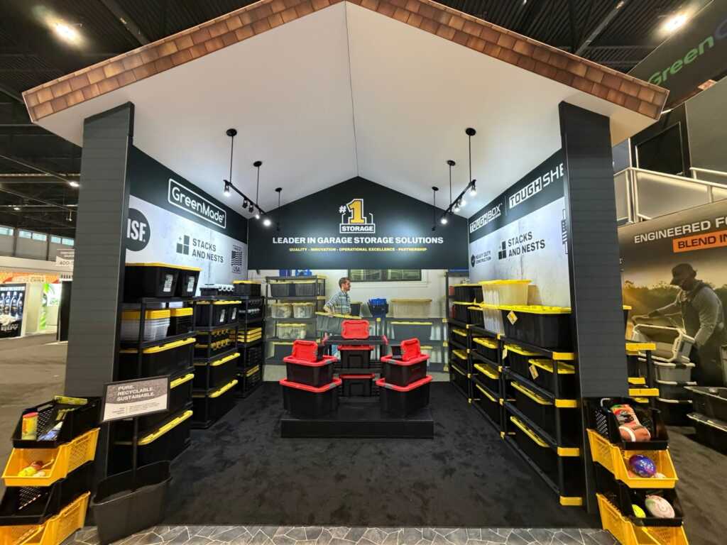 The main structure simulated a two-story home with an upper-deck VIP lounge for focused meetings. Below deck, wood-look flooring, a drop ceiling and recessed lighting created a warm, in-home experience for stackable totes and storage bins. The home’s exterior graphics extended the story to the company’s outdoor storage solutions.