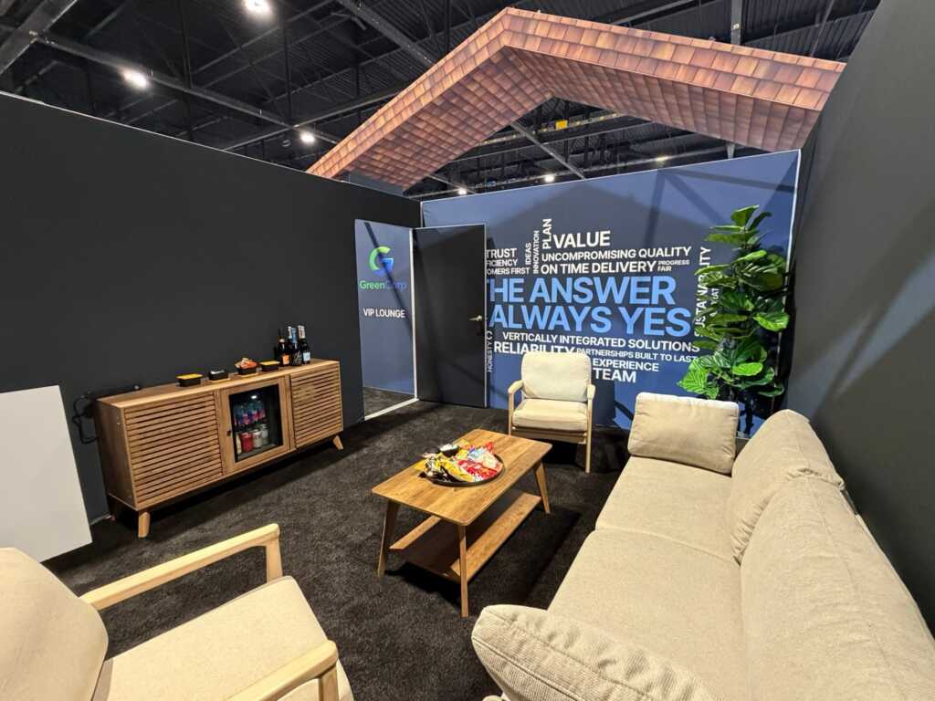 Three compact outbuildings with two-sided lightbox graphics and nested product samples gave visitors multiple touchpoints to explore the company’s innovations – including their artificial fig and olive trees, which softened the structures and reinforced the residential vibe, helping the space stand out in a big way.