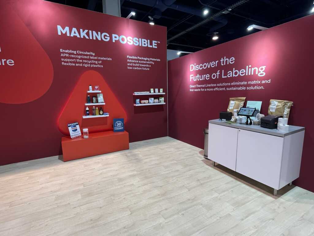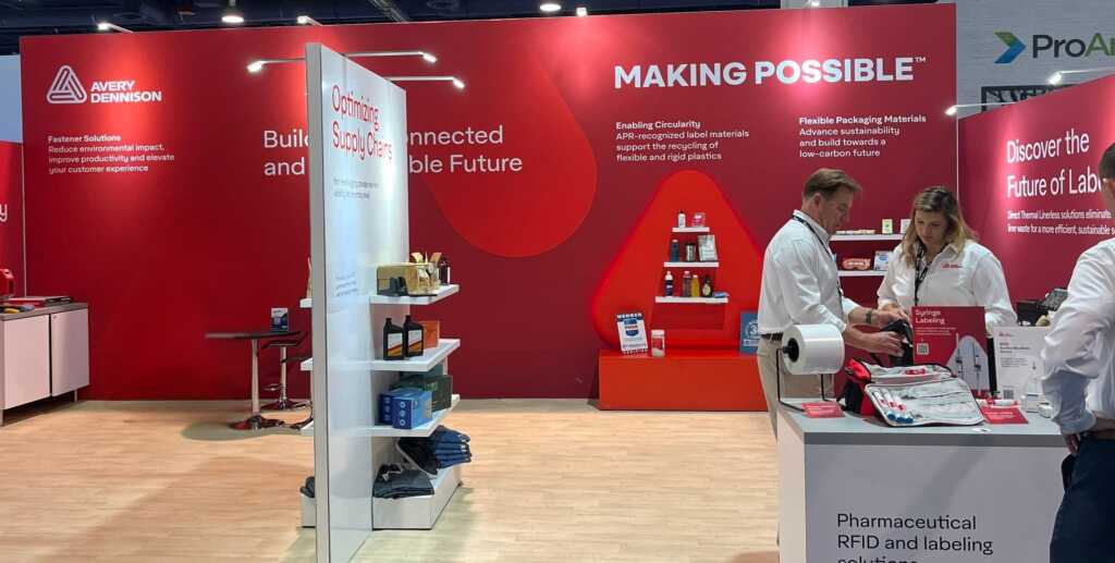 Avery Dennison’s 30’ x 20’ inline booth combined its RFID, labeling and fastener solutions for a “One Avery Dennison” experience. Eye-catching side- and backwalls featured key messaging, shelving and product samples. A two-sided product kiosk took center stage, while a reception counter, materials and equipment demos completed the layout.