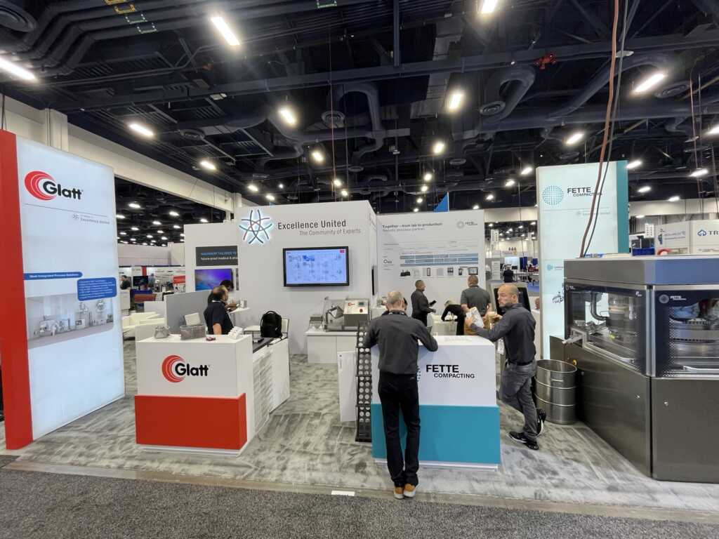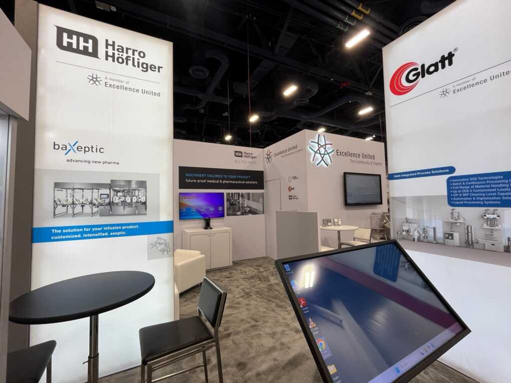 Excellence United’s collaborative pavilion brought together Fette Compacting, Glatt Group and Harro Hofliger in a combined 41’ x 20’ peninsula booth to showcase their pharmaceutical manufacturing technologies. Matching branded light towers, reception desks, interactive video, machinery demos and lounge-style seating enabled multiple ways for attendees to engage.