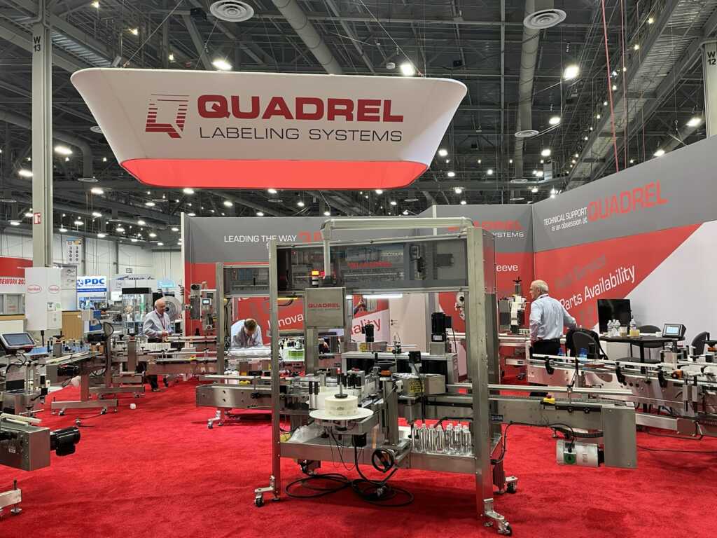 Quadrel Labeling Systems utilized a wrap-around backwall and an angular hanging sign to draw attention to its 32’ x 33’ corner inline booth, showcasing the company’s print-and-apply, RFID and shrink sleeve labeling systems. A storage closet for consumables was discreetly tucked away in the corner, while the bright red carpet and abundance of machinery demos made this classic booth a must-stop for attendees.