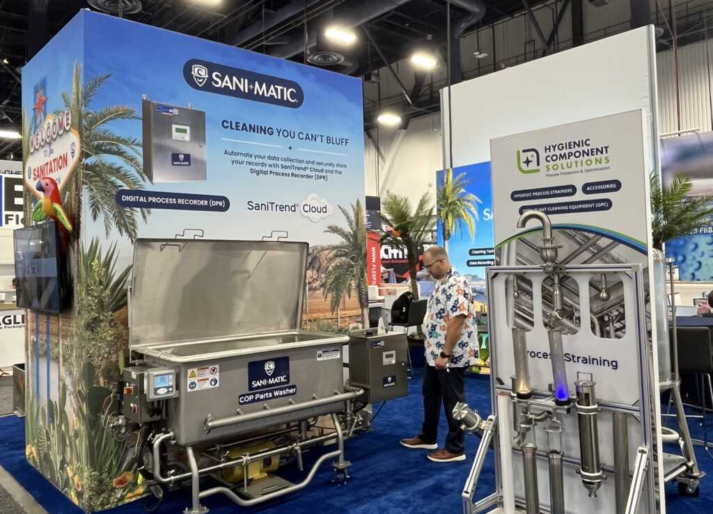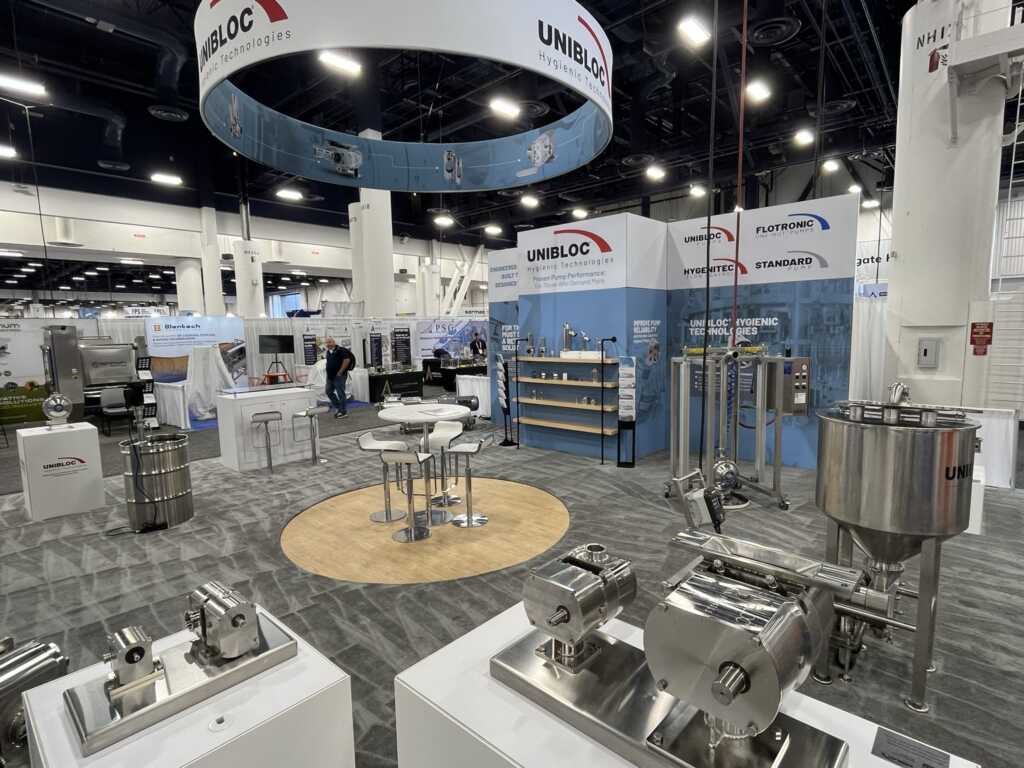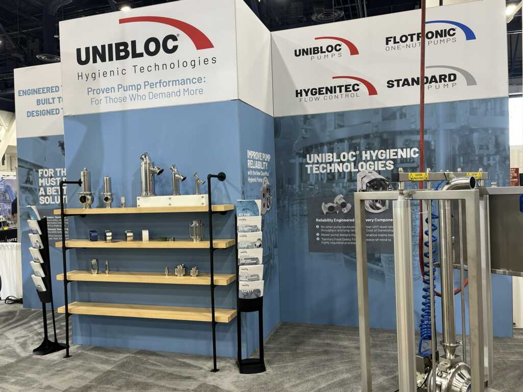 Unibloc Hygienic Technologies’ 31’ x 30’ aisle-to-aisle exhibit featured two graphic wall structures on each side of the booth, showcasing key messaging and branding. A rotating hanging sign centered over a café seating area in clear view of product display shelving and a video monitor. The enhanced traffic flow of this unique space allowed the company to showcase its full range of AODD, Gear and Lobe pumps, as well as several hands-on disassembly stations to showcase their unique, tool-free design.