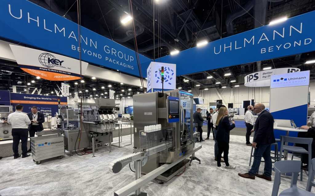 Uhlmann Group unified its divisions, including Cremer and KOCH, in a 41’ x 50’ peninsula showcase, featuring a massive, two-sided hanging sign and multiple lightbox towers to promote the company’s brands and pharmaceutical packaging solutions. A video monitor wall, equipment demos and ample seating offered a range of engagement options.